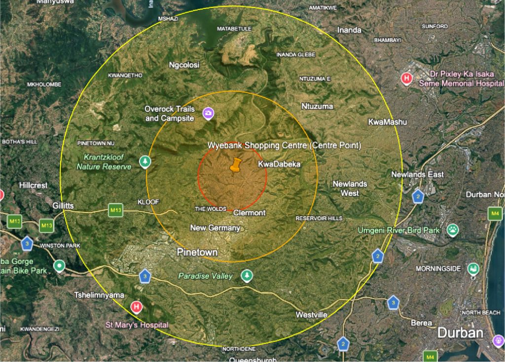 The north eastern boundary of the catchment is delineated along the New Germany boundaries. The south area is limited by travelling distances and population spread. The area functions as a prominent node – Wyebank Node.